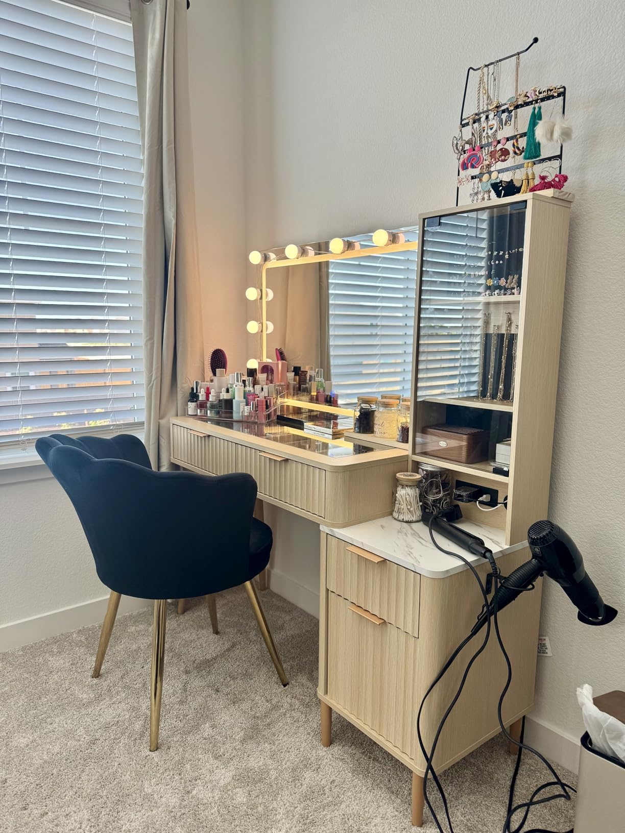 The 36" Full-Sized HD Lighted Mirror is the centerpiece of this vanity desk, providing optimal lighting for flawless makeup application. With adjustable brightness and three light settings, you can create the perfect ambiance for any beauty routine, from a fresh daytime look to a glamorous evening style.