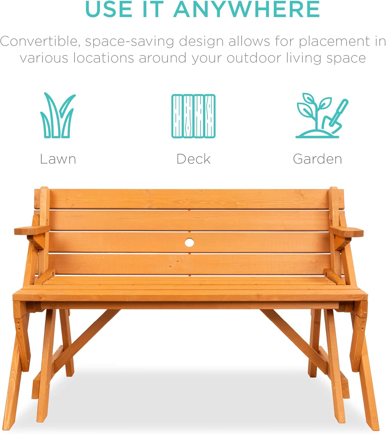 Enjoy the best of both worlds with this versatile outdoor furniture. Transform it from a picnic table to a garden bench in seconds—perfect for dining or lounging in your backyard, patio, or garden. Crafted from sturdy natural wood, it seats up to 4 people as a table and 2 as a bench, while remaining lightweight for easy movement. The built-in 1.5" umbrella hole offers shade on sunny days, and its unfinished surface is ideal for painting or staining to match your outdoor style.