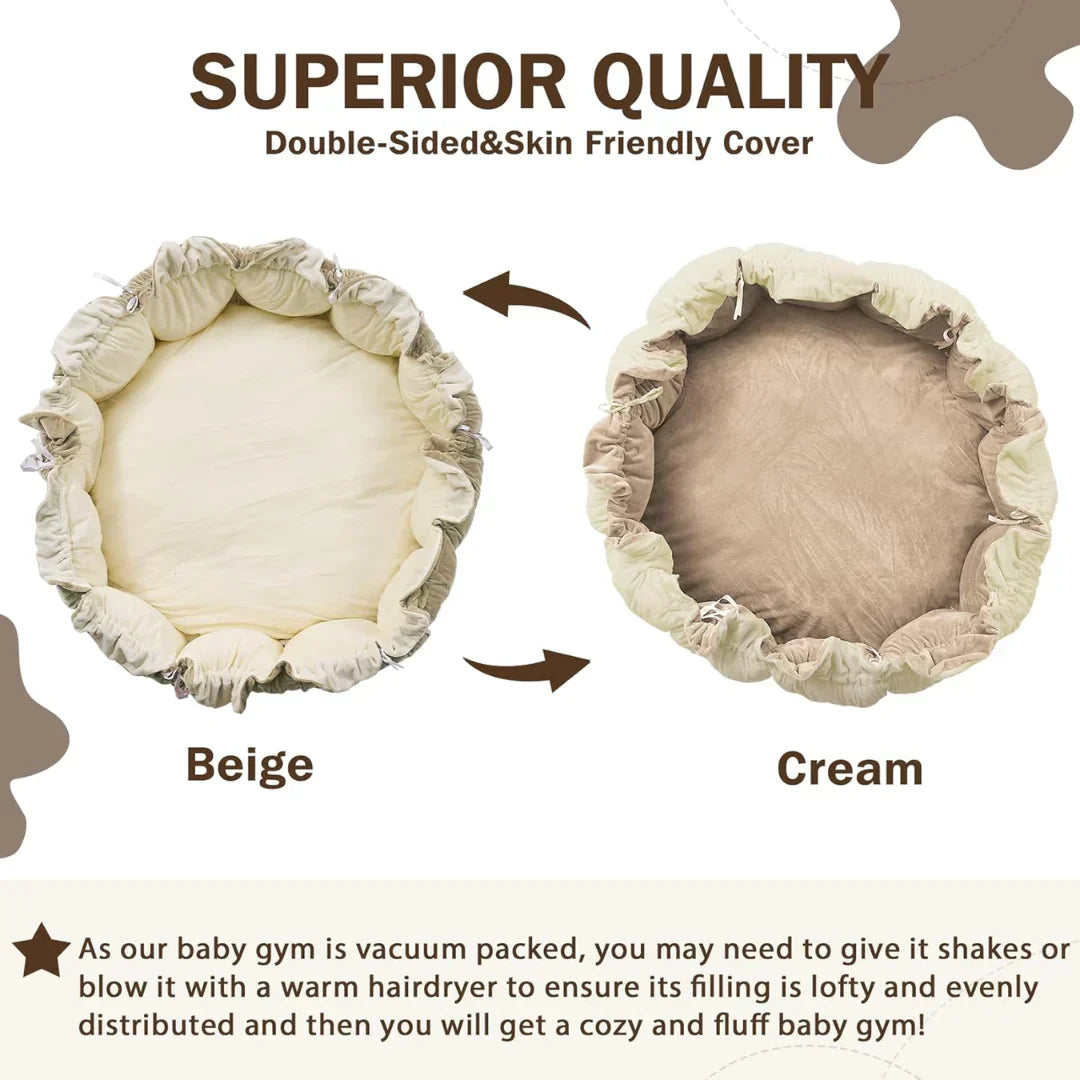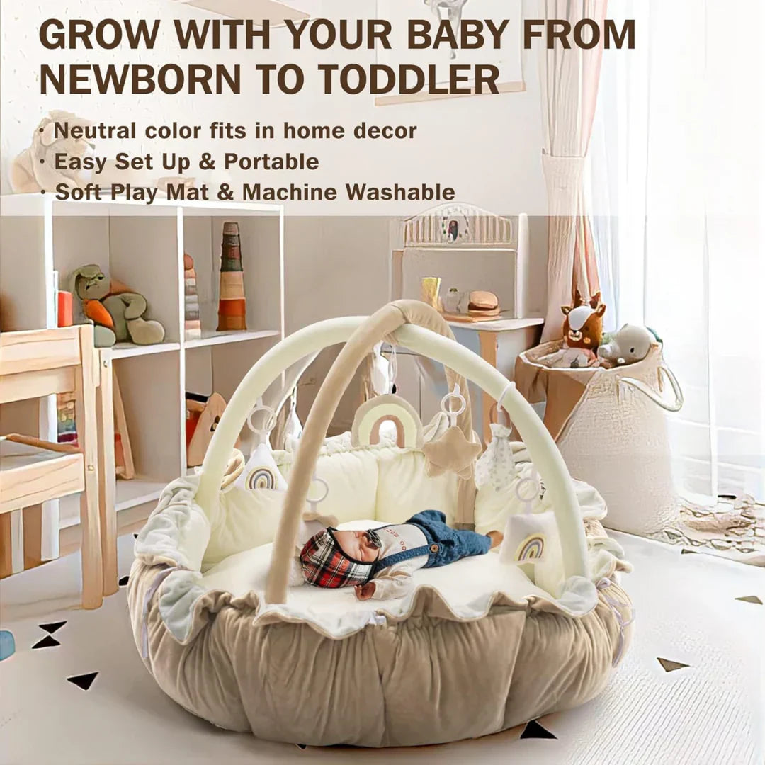 Transform playtime with this 5-in-1 convertible baby gym—a perfect blend of baby gym, nest, play mat, ball pit, and fence. It creates a secure, enclosed space where your baby can play, explore, and grow.