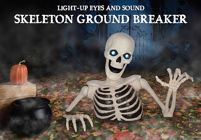 Whether you’re setting up for trick-or-treat night or hosting a Halloween party, this ground-breaking skeleton is the perfect centerpiece for a bone-chilling display.