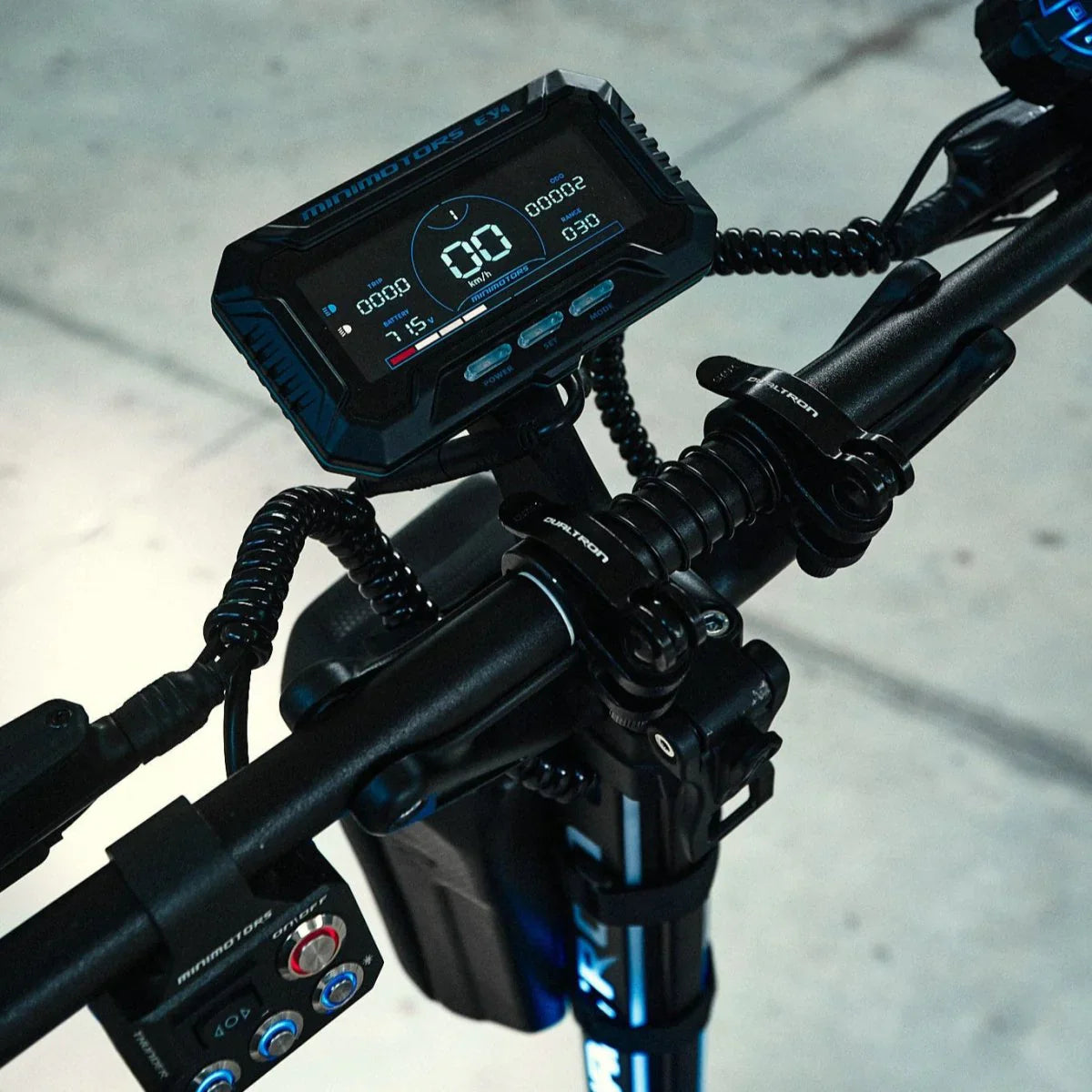 In addition to its modernized design, improved folding system, and luminous finishes, the Dualtron Thunder 3 has other surprises in store for us. The Minimotors brand has made improvements in terms of visibility and customization. This technological gem incorporates anew central EY4 LCD screen and an OVERTAKE index triggerfor superior ergonomics. Configurable via an Android and iOS compatible application, it allows you to manage the boost mode, electronic anti-theft, and lighting effects.