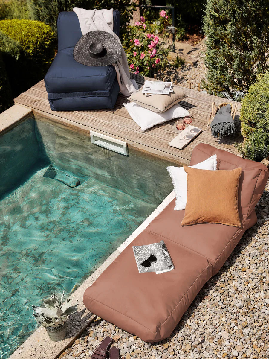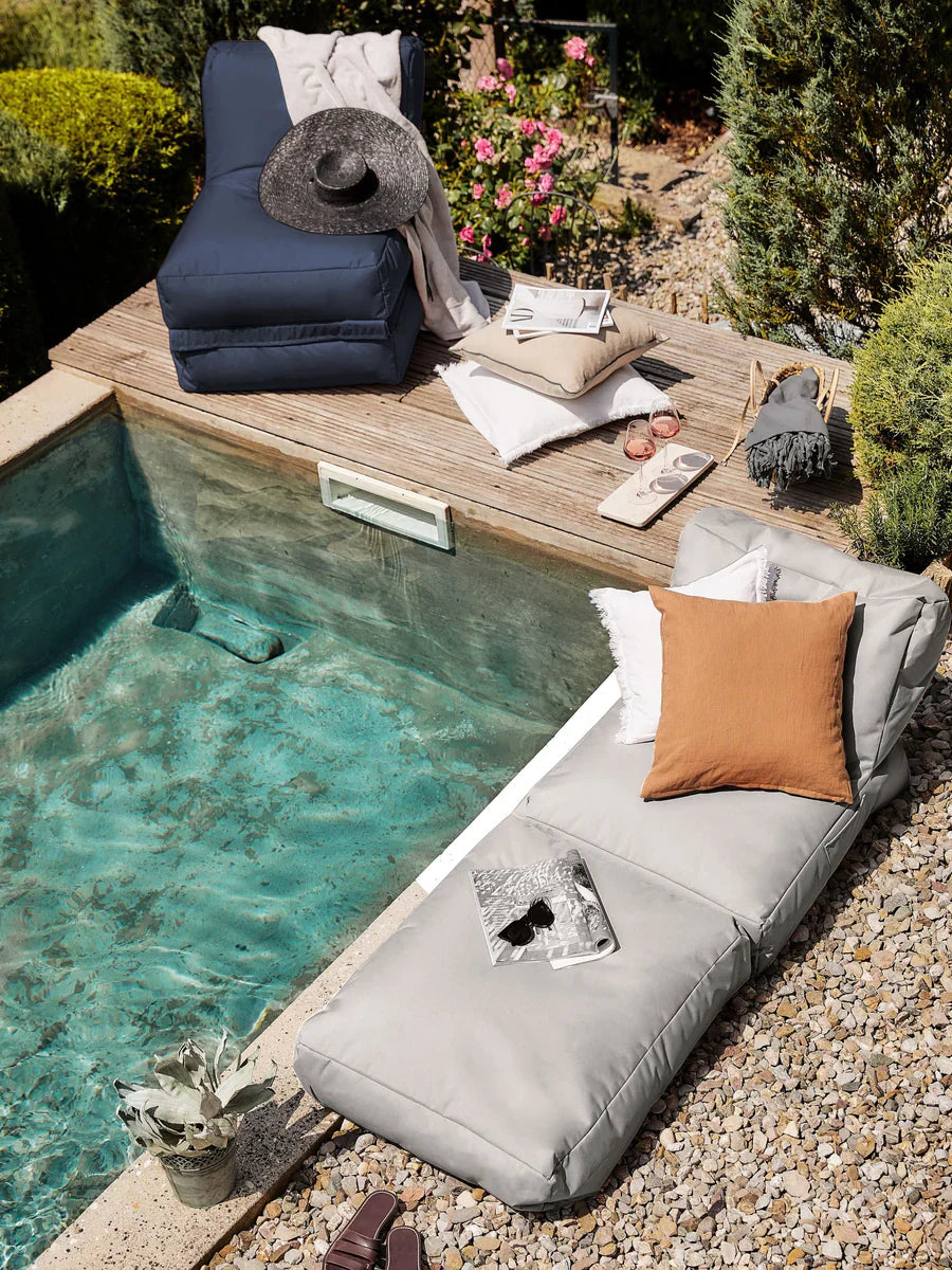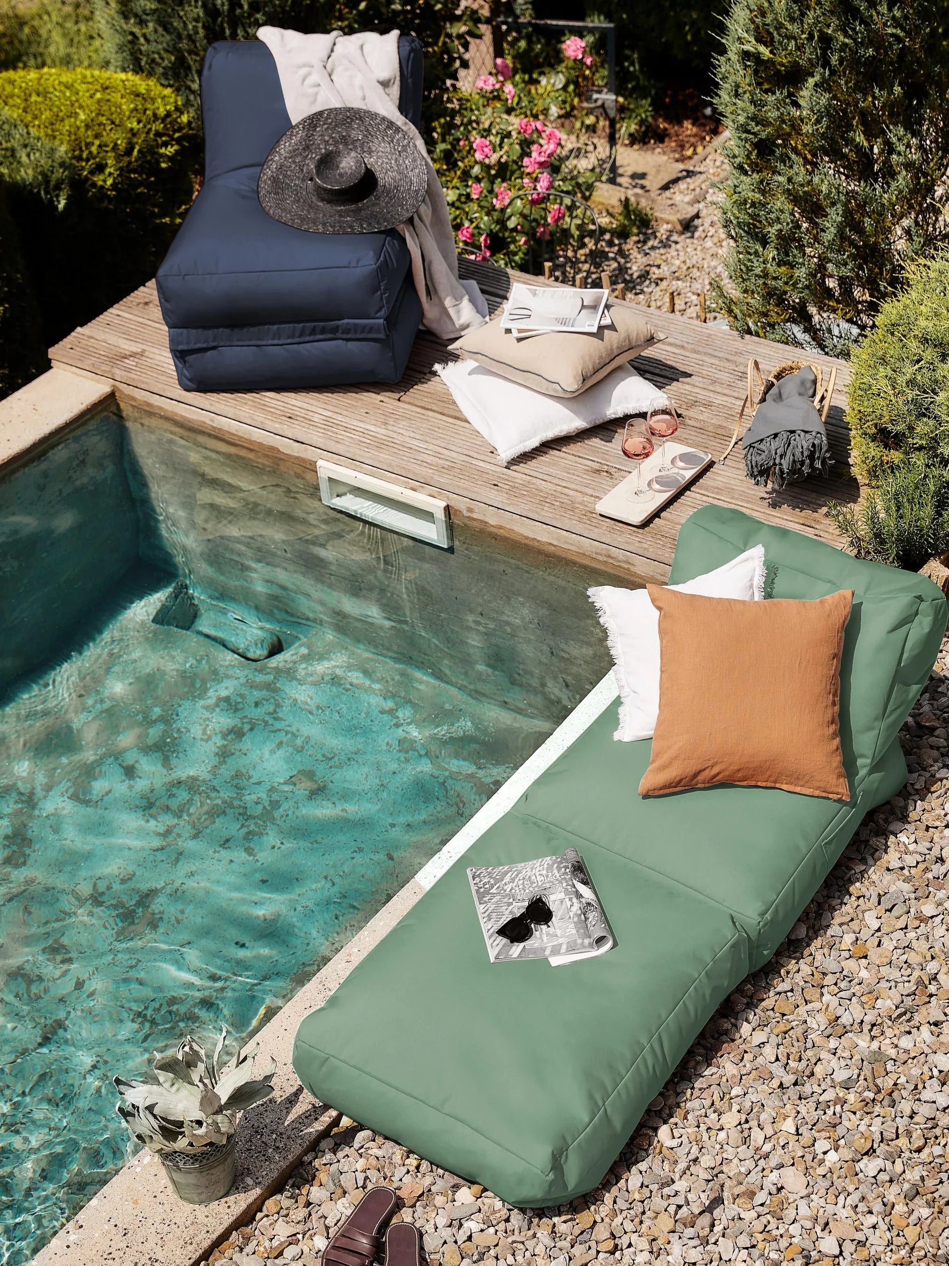 Garden sofa bed with chaise longue function impresses with its soft seating quality due to the ergonomic adaptation of the polystyrene beads. The footrest is removable thanks to a Velcro fastener. Made in Germany.