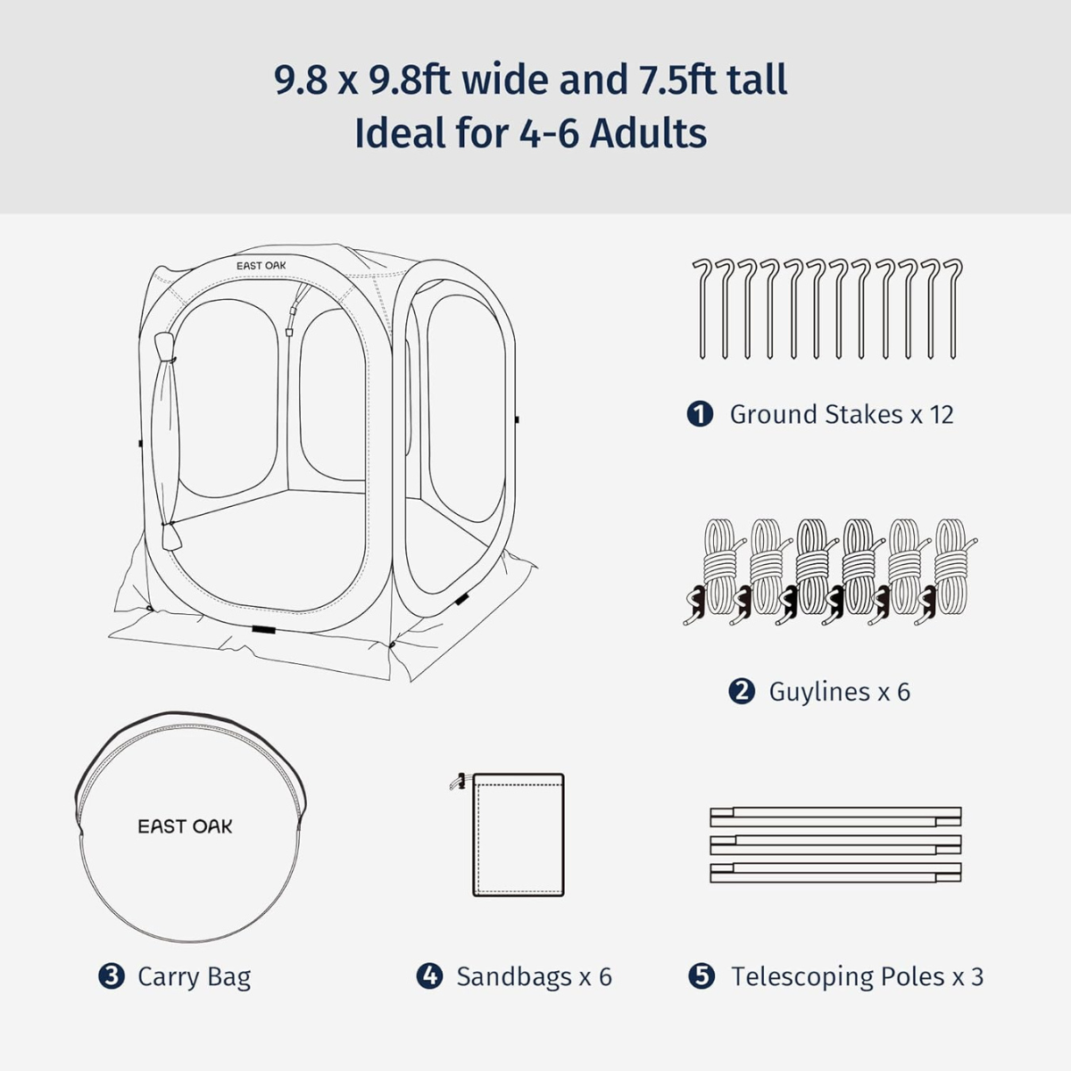 Made with durable fiberglass poles, it comes with 3 support poles, 12 ground stakes, 6 wind ropes, and 6 sandbags for excellent wind resistance and long-lasting use.