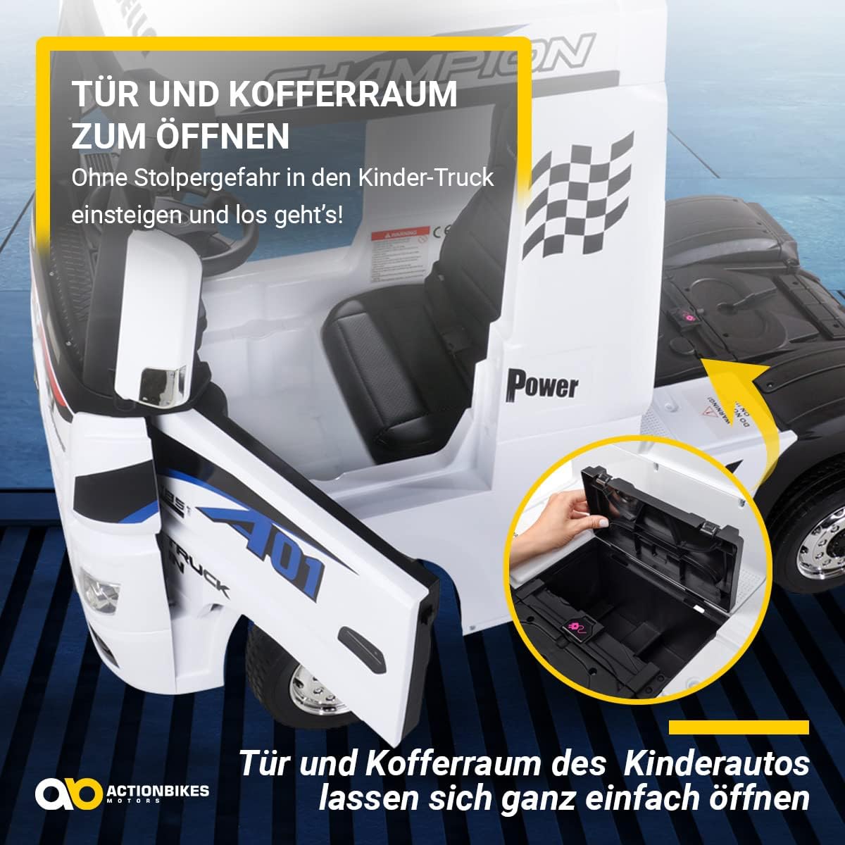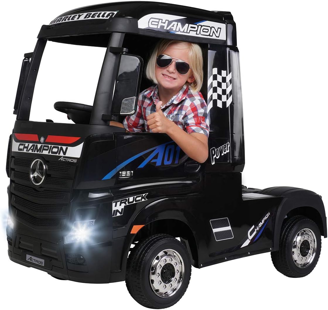 • The Mercedes-Benz Actros (HL358) electric car is an incredible new addition to the 2019 lineup. No one expected such a design! The model is styled like a tractor truck, absolutely identical to the unique and legendary Mercedes Actros. This model is for real little guys who love professional vehicles. It features a spacious, comfortable enclosed cabin, accessible by opening the door. The steering wheel is horizontal, just like a real truck, and features a radio and other controls for the toy car. It features all-wheel drive, rubber tires, a leather seat, lighting effects, and a remote control for adjusting the ride as needed. This unique model will impress and will make a memorable gift for any occasion!